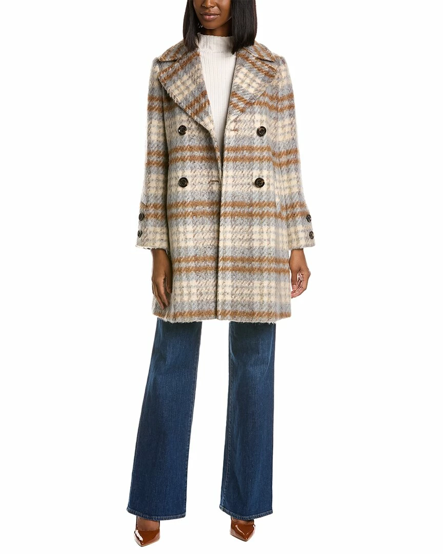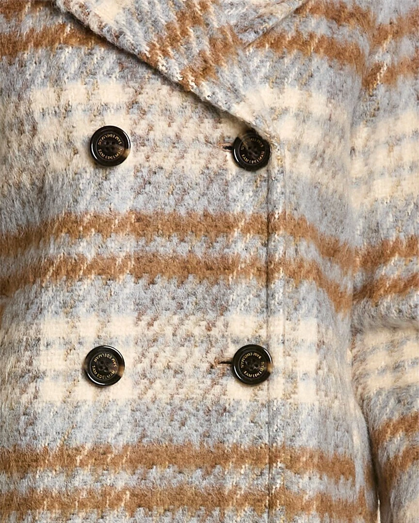 - Double-Breasted Flared Wool-Blend Coat In Camel Multi Plaid With Notched Lapel, Two Front Pockets, Button Accents At Cuffs And Center Vent At Back Hem