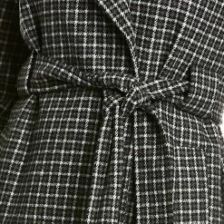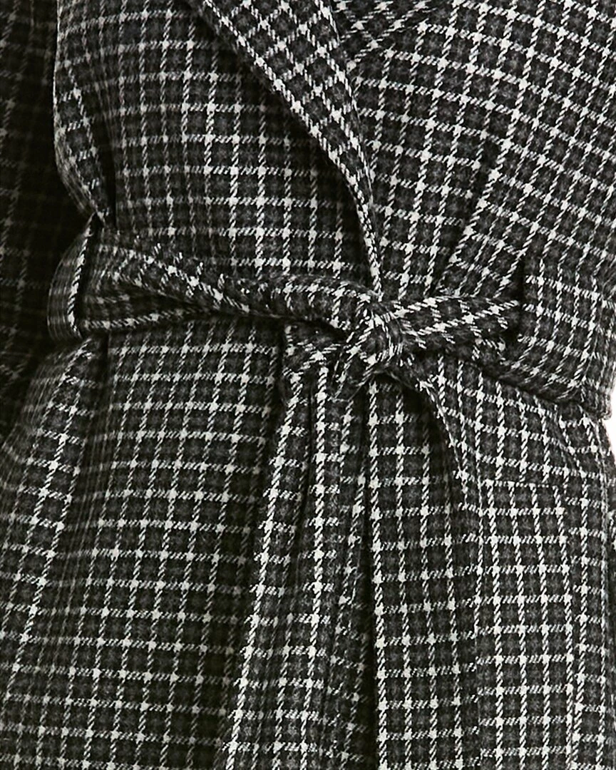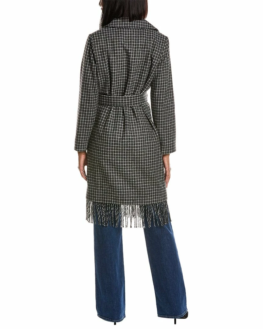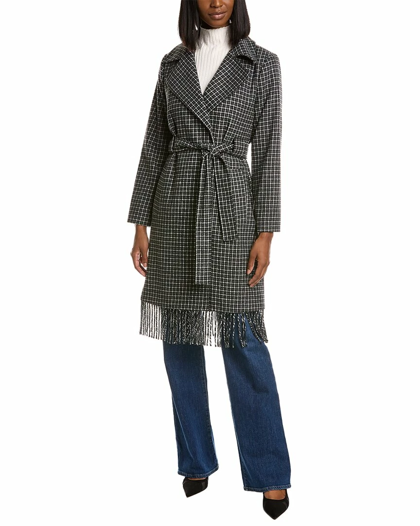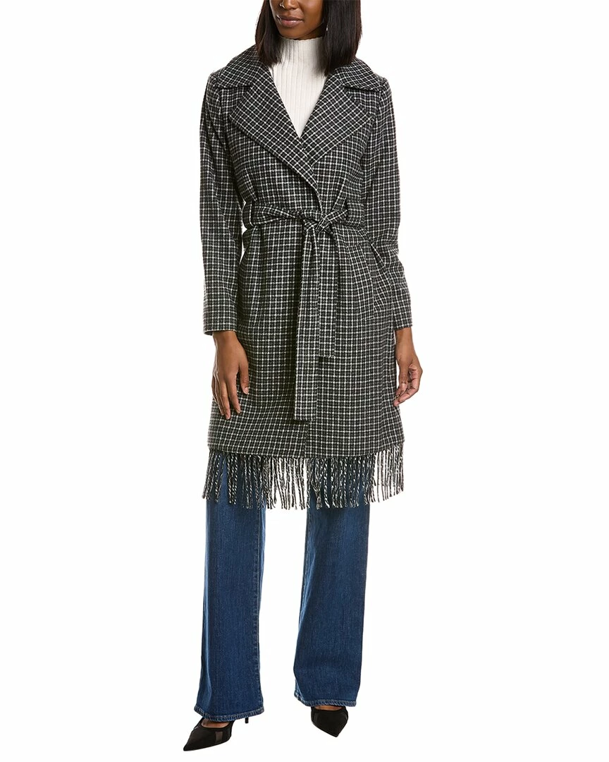 - Fringe Wool-Blend Wrap Coat In Black/White Novelty With Notched Lapel, Two Front Pockets, Self-Tie Belt At Waist And Fringe Hem