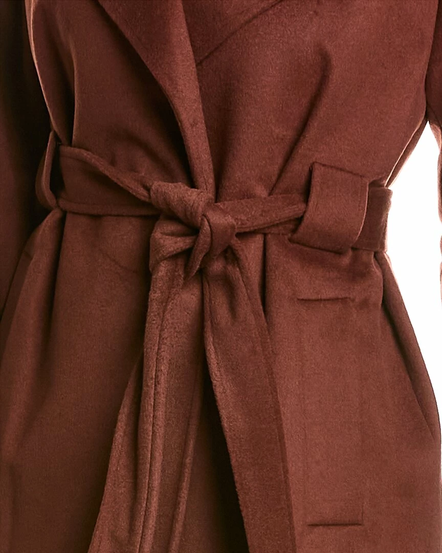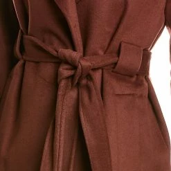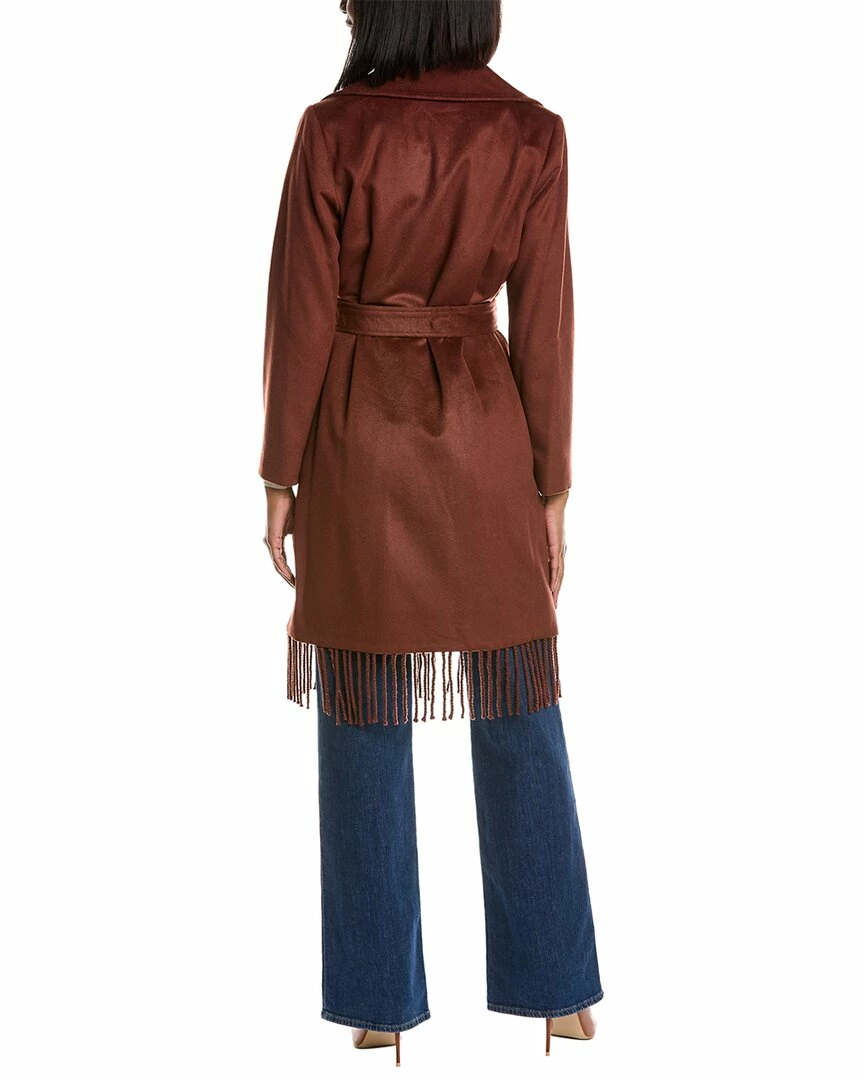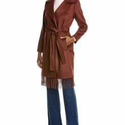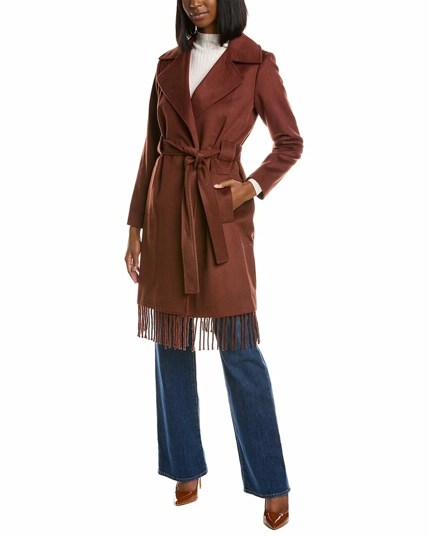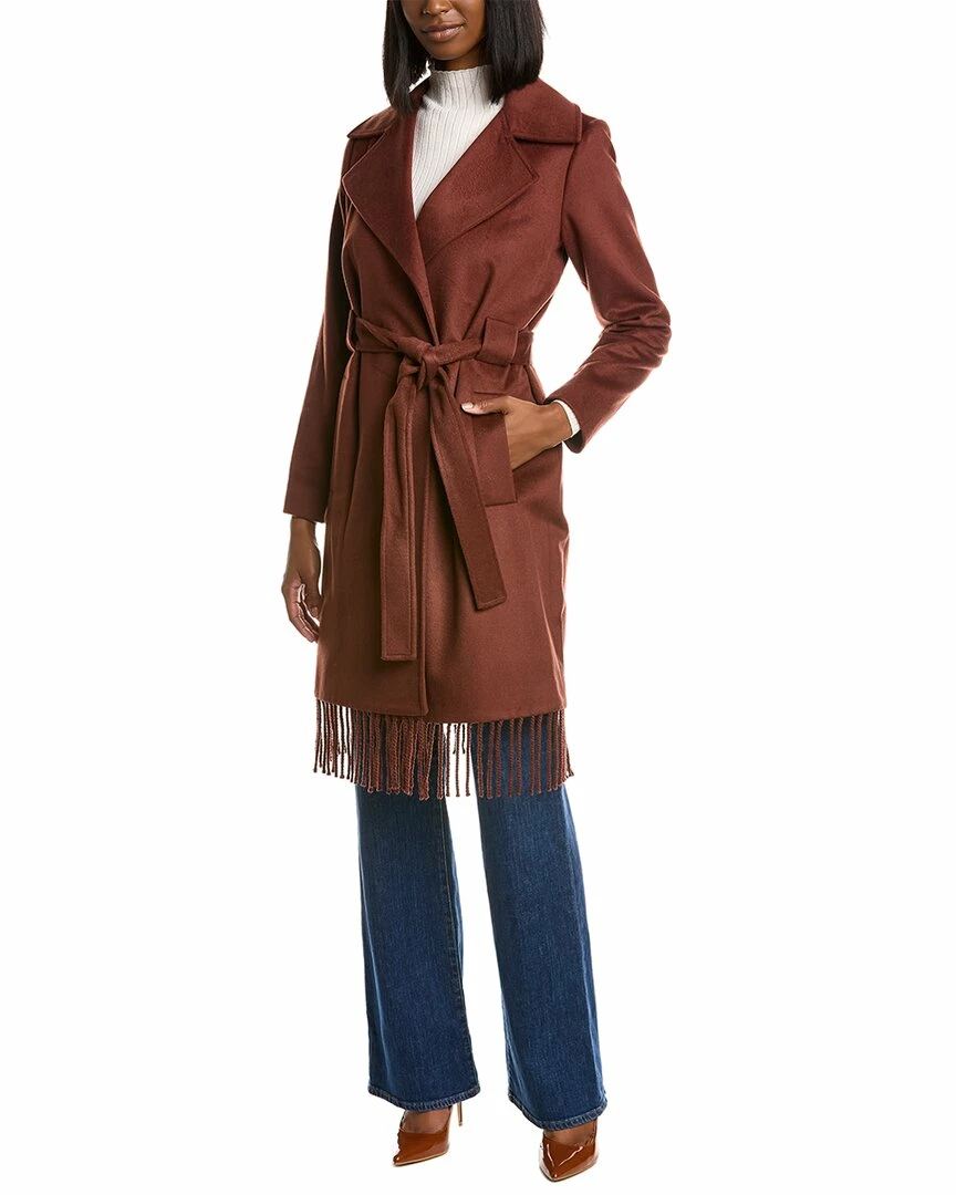 - Fringe Wool-Blend Wrap Coat In Chestnut With Notched Lapel, Two Front Pockets, Self-Tie Belt At Waist And Fringe Hem