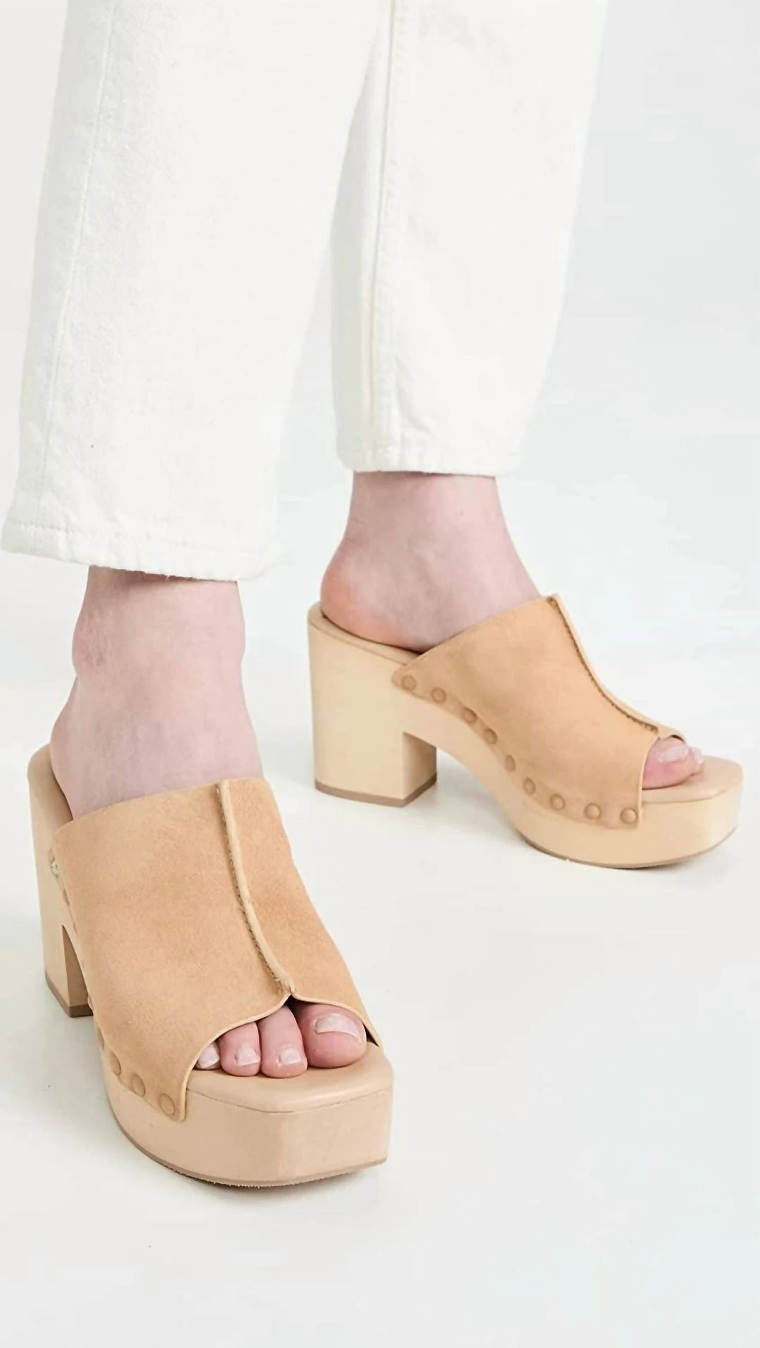 With monochrome studs and a chunky wooden platform sole, these open toe clogs are a vintage dream. Perfect for brunch or museum date, thanks to the padded foam lining.