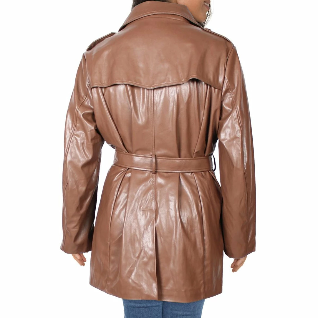 Keep your look bold in this faux leather belted coat by Sam Edelman. Made with 100% Polyurethane. The glossy faux leather and trench inspired construction will make this a closet essential. It features two front pockets with notch lapel and button closures.