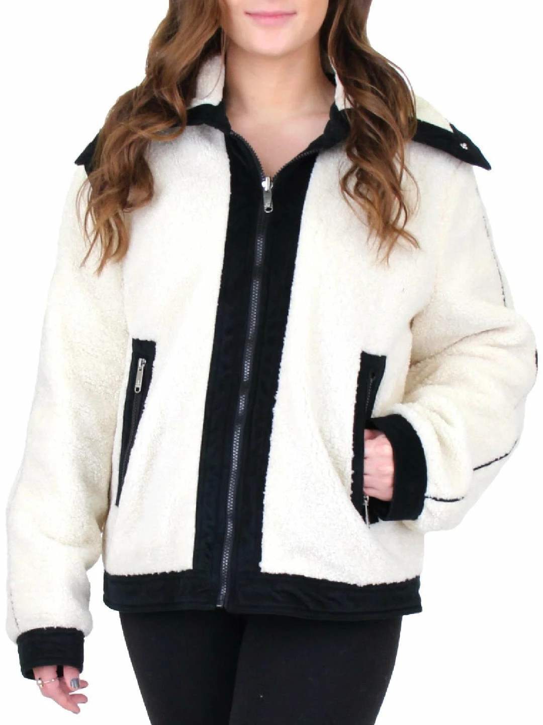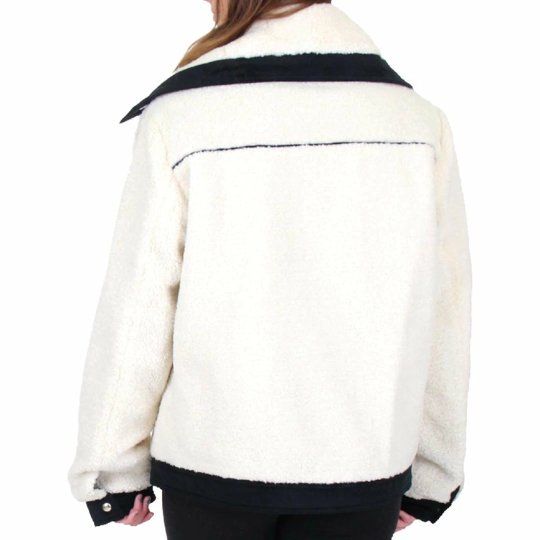 Stay warm and cozy in the Short Berber faux fur contrast trim coat by Sam Edelman. Made with polyester and nylon materials. This coat features soft faux fur fabric and contrast trim details that go well with any outfit. Quilted lining is reversible for customized style and convenience. Wide, convertible collar. Chic short length. Long, oversized sleeves. Full zipper closure. This coat is guaranteed authentic.