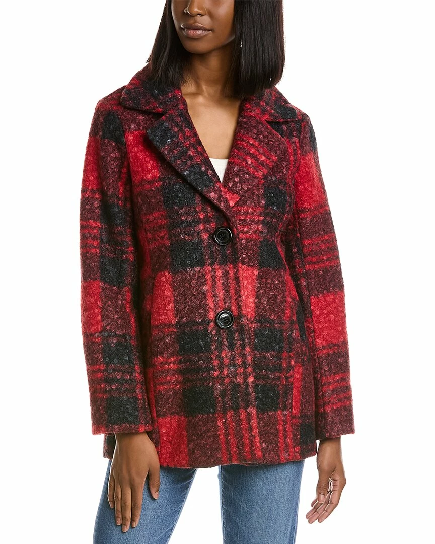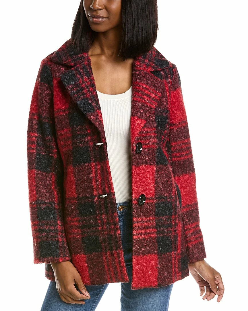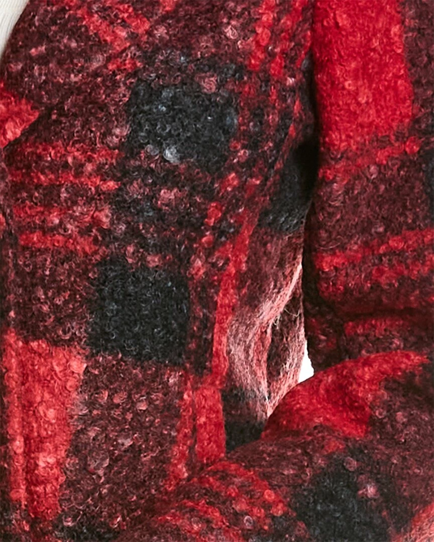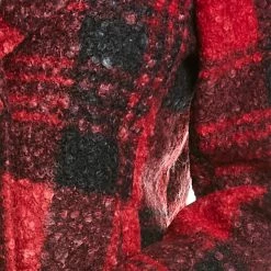 - Short Plaid Teddy Jacket In Red/Charcoal Plaid With Boucle Design, Notched Lapel And Two Front Pockets