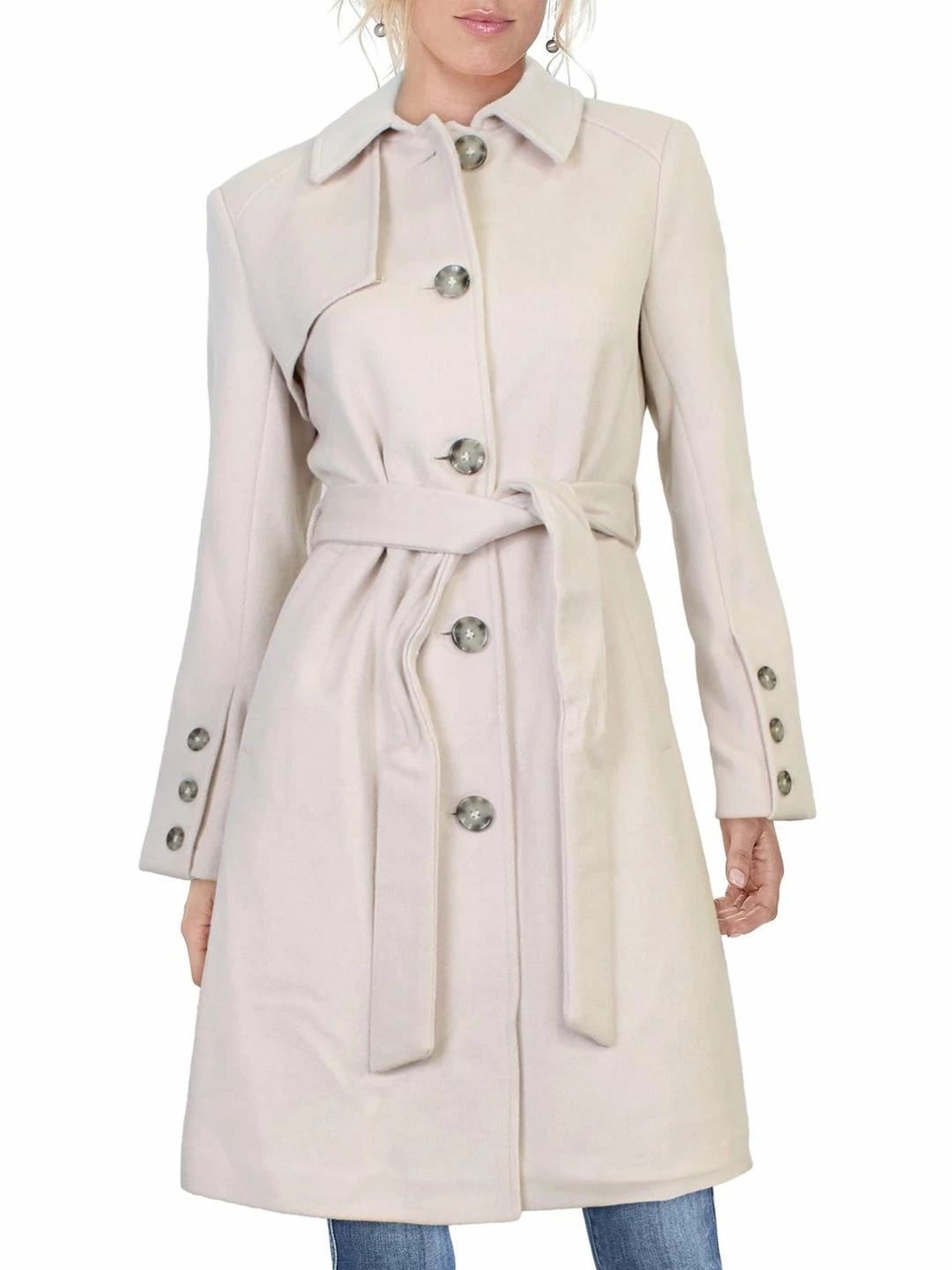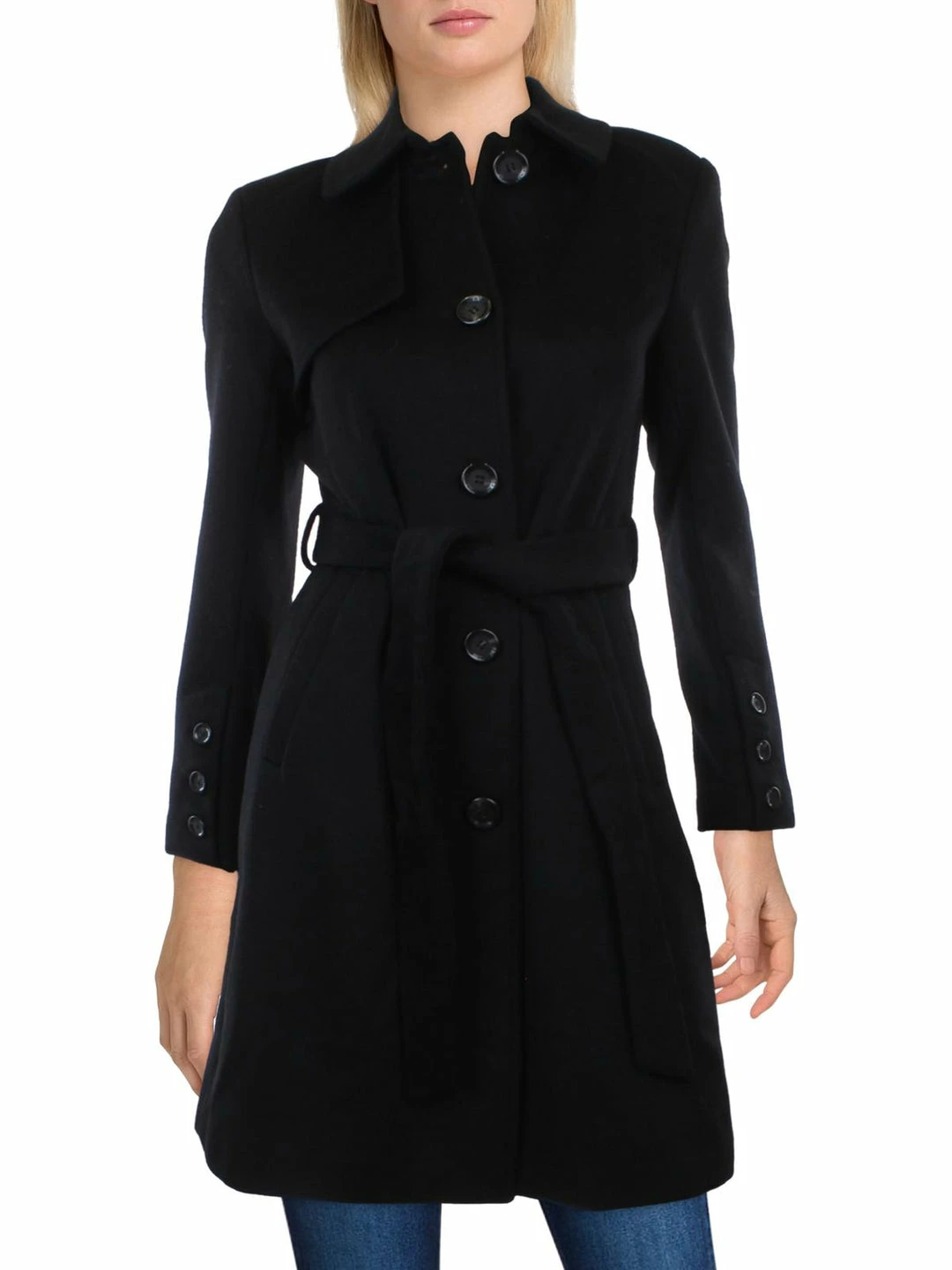 Head out the door looking well polished in this wool blend coat by Sam Edelman. Made with 56% Wool, 38% Polyester, 2% Acrylic, 2% Nylon & 2% Rayon. The mid-length design will make it perfect for layering. It features a belted waist with spread collar and button closures.