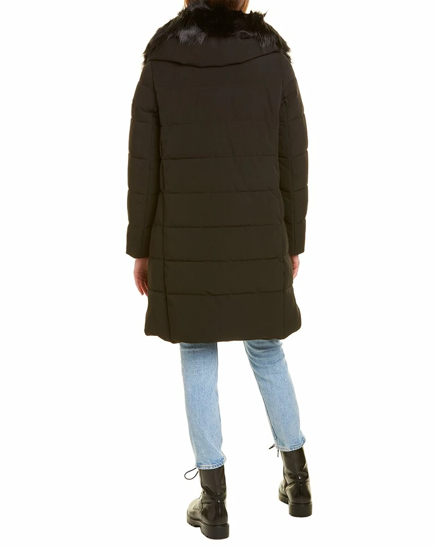 - Zip Front Puffer Jacket In Black With Quilted Design, Hooded Back With Removable Faux Fur Trim, Two Front Zippered Pockets And High-Low Hem With Zippered Side Slits